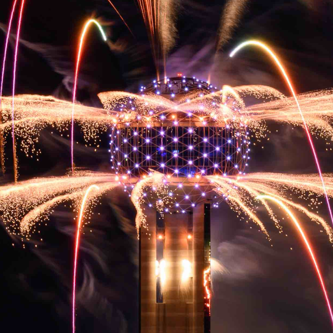 Reunion Tower and Hunt Realty Investments, Inc. present the 10th annual Lone Star NYE: “The Most Colorful Year Yet.” The show features an expanded display with over 5,000 pyrotechnic effects, a stunning 259-LED light show, and 500 drones taking to the sky, some even carrying pyrotechnics.